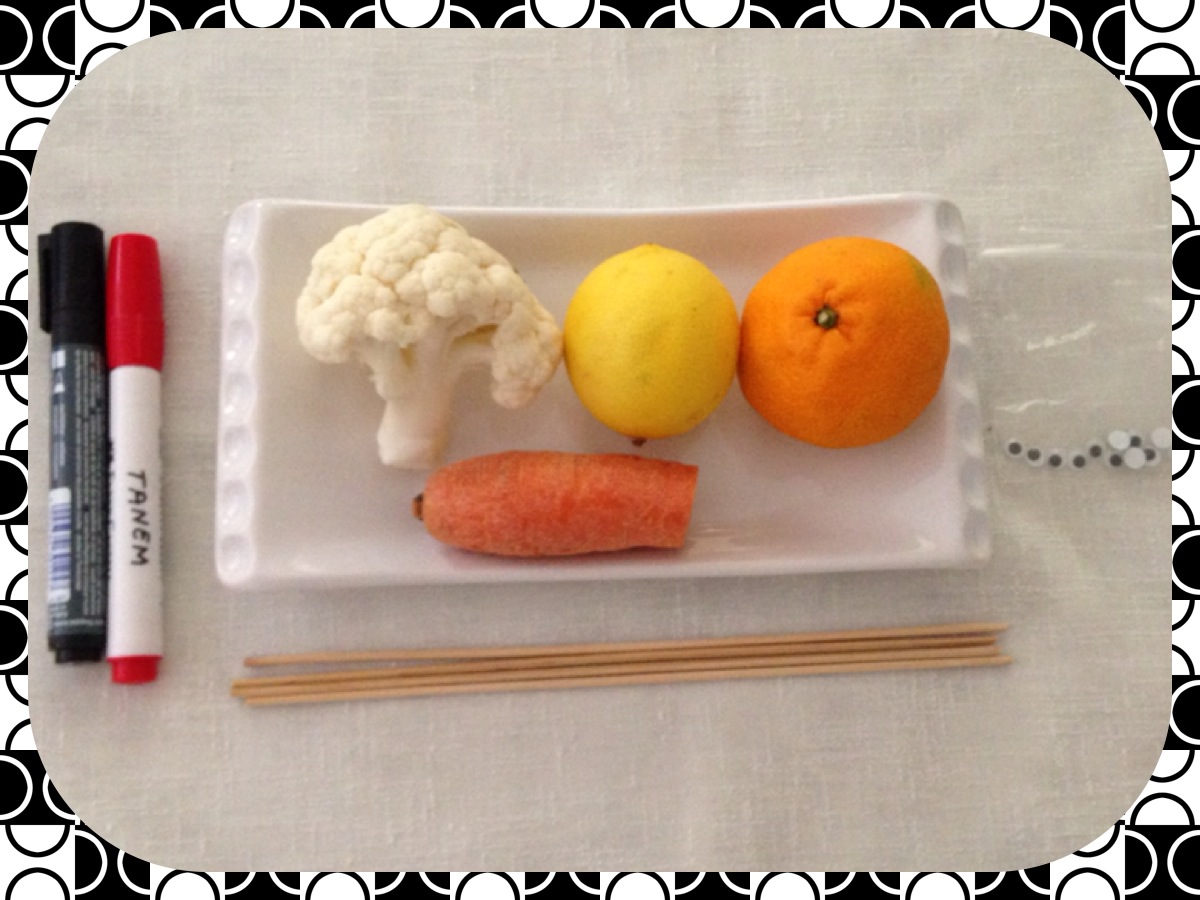 GEREKLİ MATERYAL: Çeşitli meyve ve sebzeler, çöp şiş, oynar göz, yapıştırıcı,tahta kalemi.