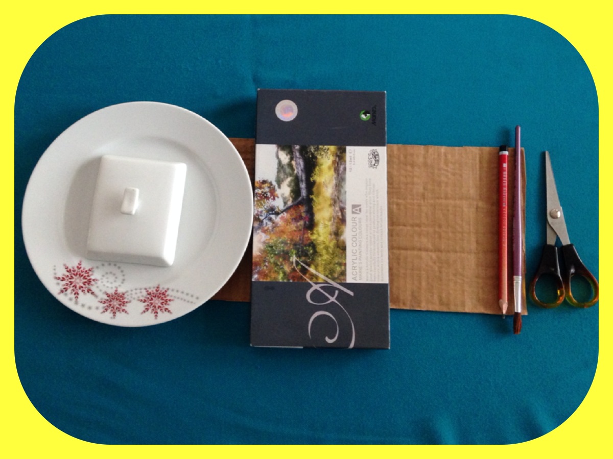 GEREKLİ MATERYALLER: Koli kartonu, makas, kurşun kalem, akrilik boya, fırça, A4 beyaz kağıt, çizmek için tabak, kapak.